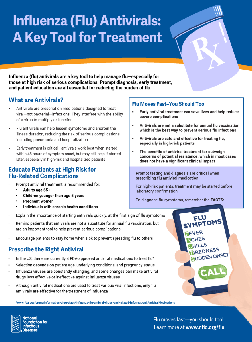 Influenza (flu) antivirals are a key tool to help manage flu—especially for those at high risk of serious complications. Prompt diagnosis, early treatment, and patient education are all essential for reducing the burden of flu.