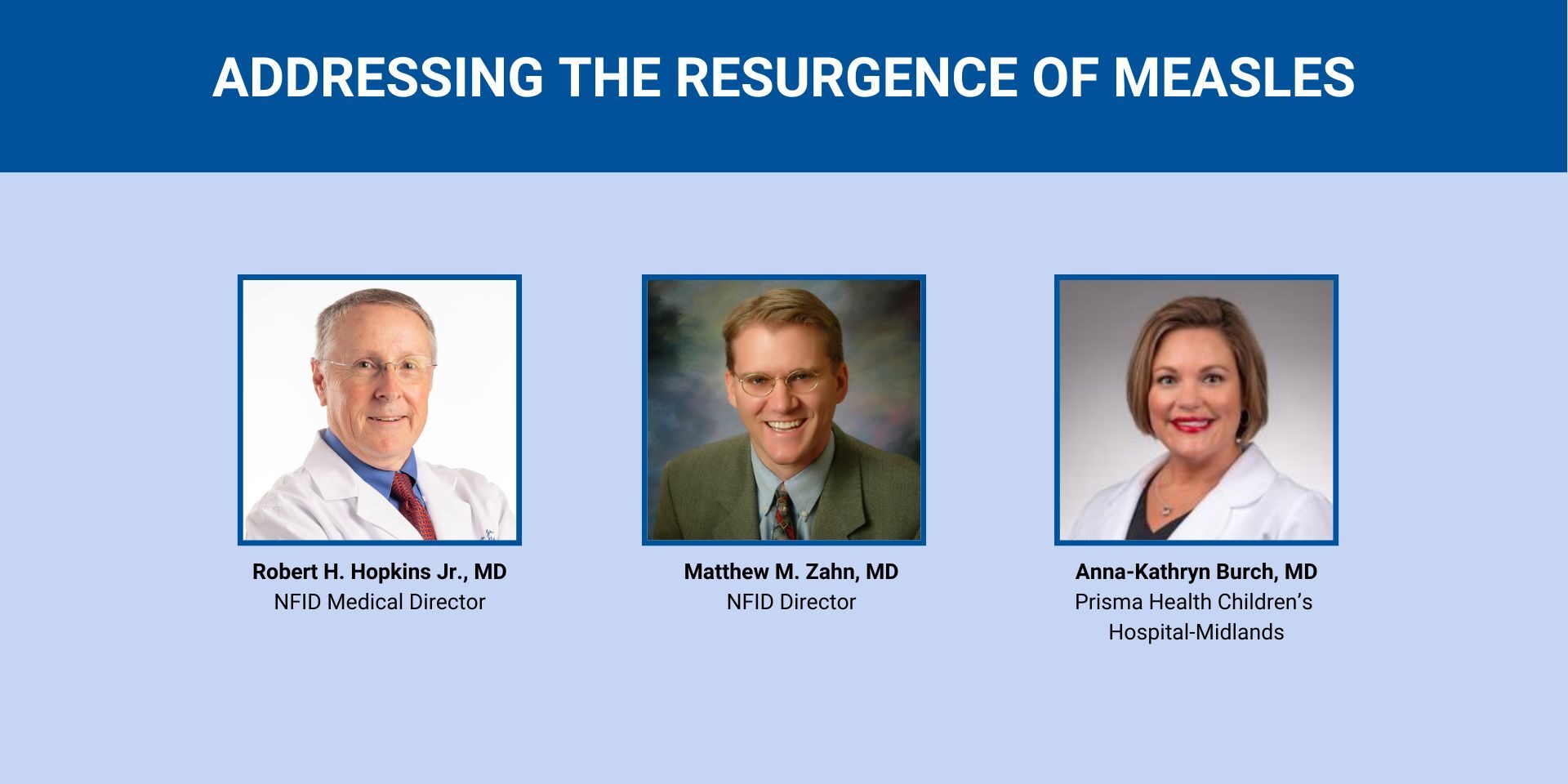 NFID Medical Director Robert (Bob) H. Hopkins, Jr., MD, will moderate the discussion with NFID Director Matthew M. Zahn, MD, Pediatric Infectious Disease Physician at Rady Children’s Health and Anna-Kathryn Burch, MD, Director of Pediatric Infectious Diseases at Prisma Health Children’s Hospital – Midlands and Associate Professor of Pediatric Clinical Medicine at the University of South Carolina School of Medicine.